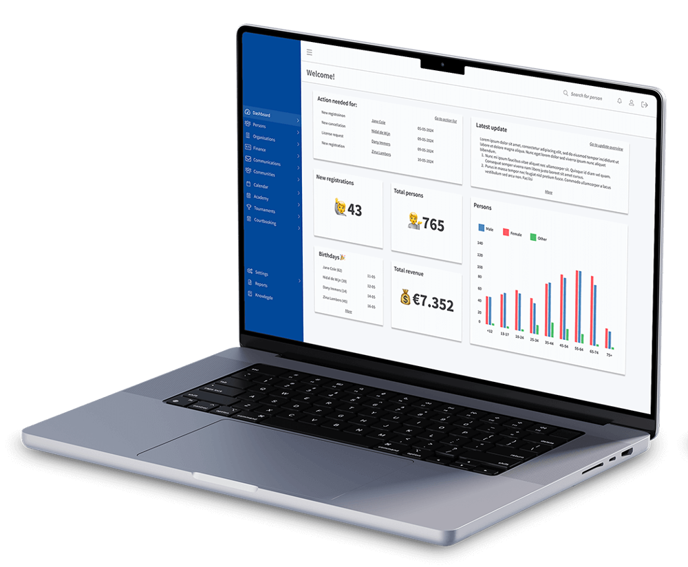 Automatiseer al je verenigingsprocessen, van ledenadministratie en lidmaatschappen tot registratie en facturatie. Beheer alles eenvoudig op één plek, waardoor vrijwilligers van de club minder tijd kwijt zijn aan administratie en meer ruimte hebben om zich te richten op de ontwikkeling van de vereniging.