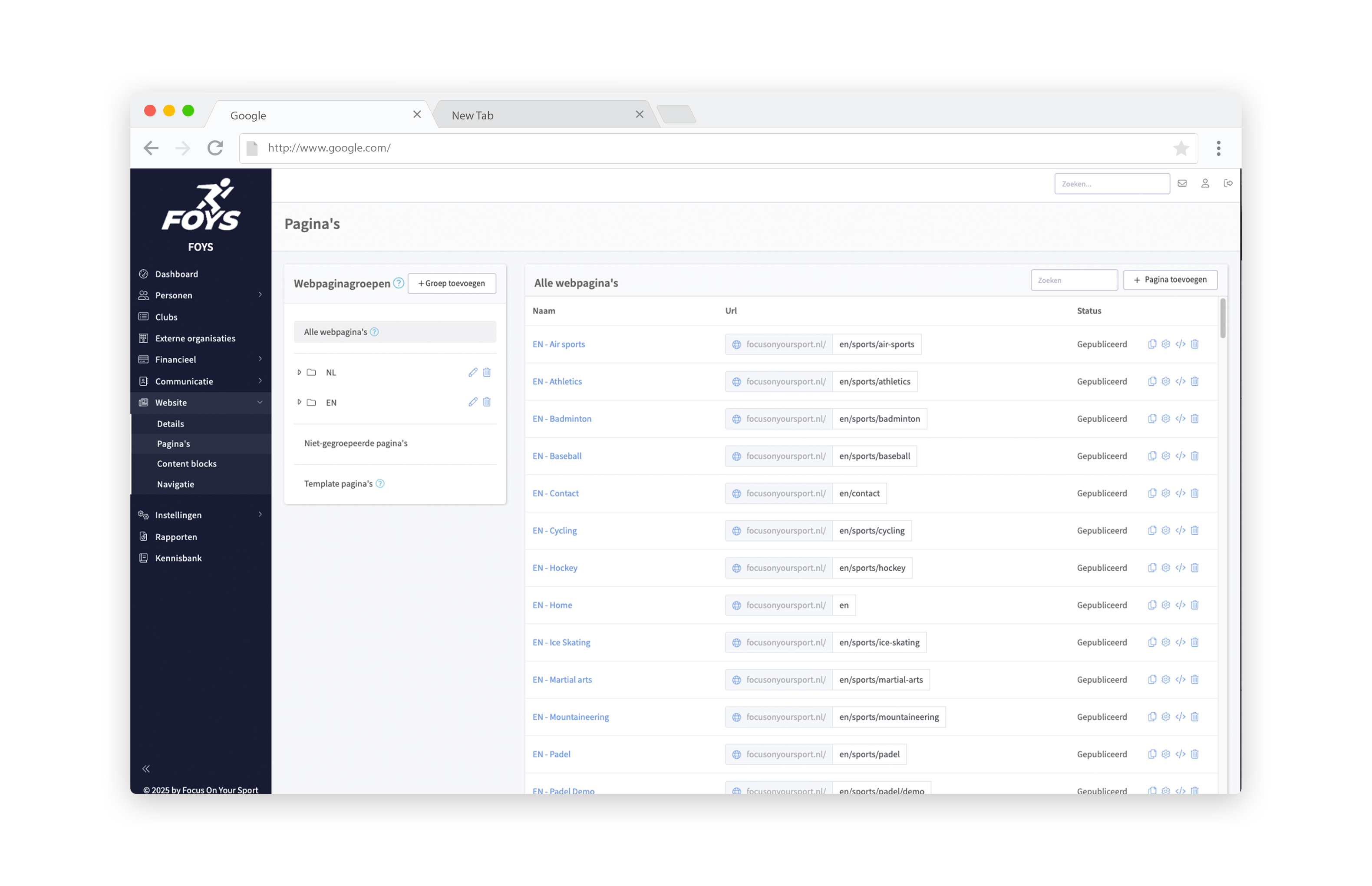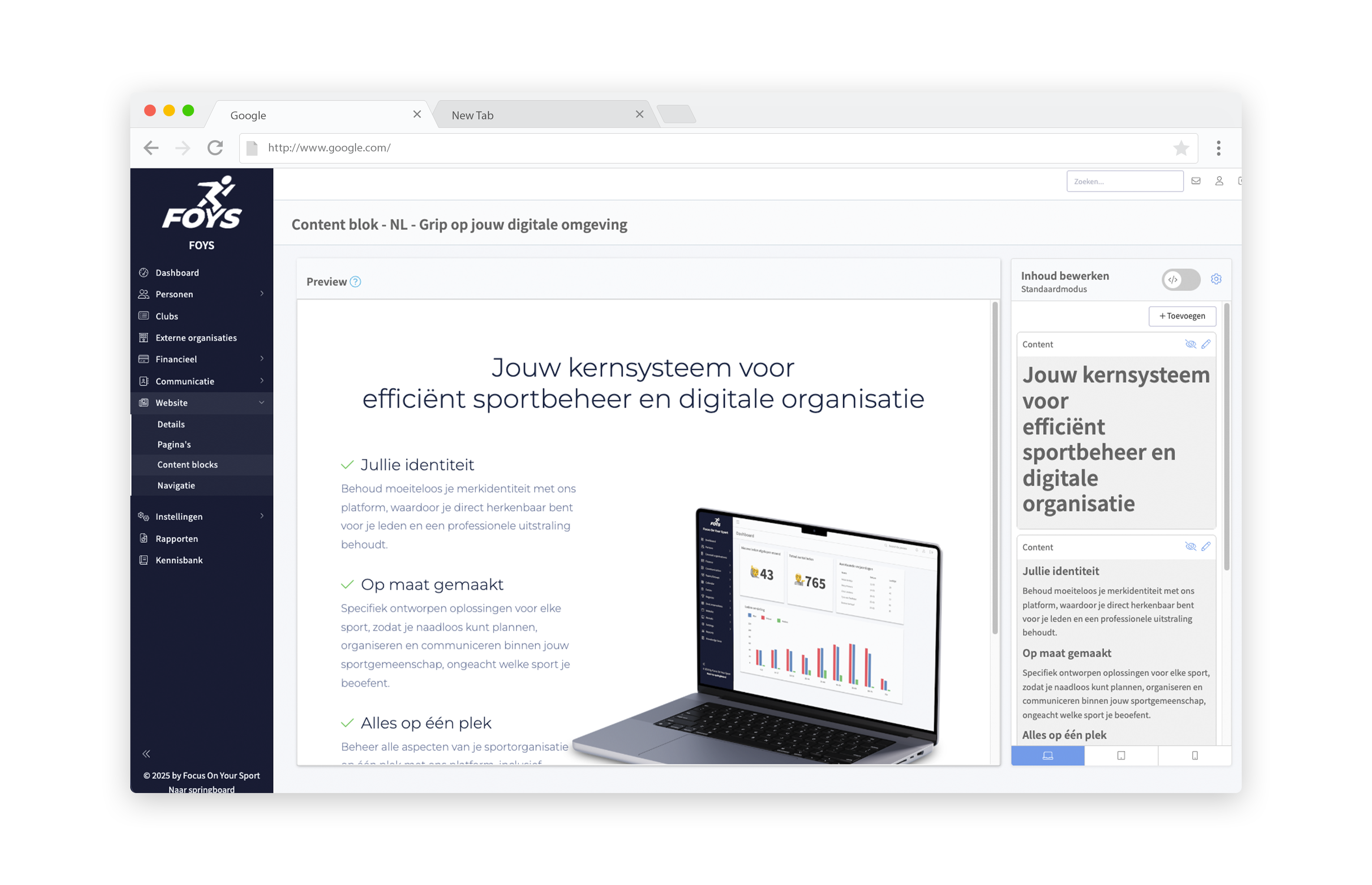 Met FOYS krijg je een professionele website die tot in detail is afgestemd op jullie identiteit; van kleuren en indeling tot content, widgets en functionaliteit. Elke keuze draagt bij aan een herkenbare, moderne uitstraling die vertrouwen wekt bij leden, sponsors en bezoekers.